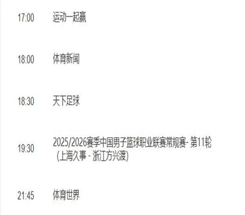 央视最新节目单显示,央视体育频道(CCTV5)、体育赛事频道(CCTV5+)将现场直播2场。其中,CCTV5将从19:30开始,聚焦直播上海久事与卫冕冠军浙江广厦方兴渡的较量。