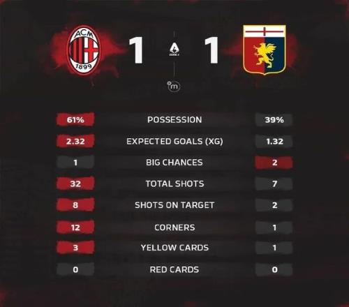 北京时间1月9日凌晨3时45分,意甲第19轮,米兰坐镇圣西罗球场迎战热那亚。上半场,科隆博首开记录。米兰半场0-1落后热那亚。下半场,普利西奇打进一球,但是被吹犯规在先,莱奥补射阶段绝平,随后巴特萨吉送点,斯坦丘罚丢。最终米兰1-1战平热那亚。