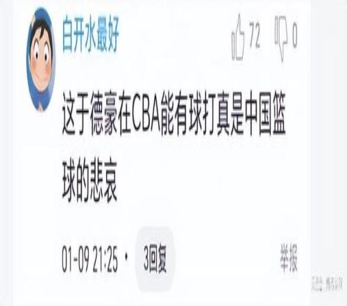 说实话,如果昨晚不是缺席了后卫高诗岩,于德豪根本就得不到这么多时间。于德豪本赛季断崖式下滑,从上季的场均6.9分下滑到如今的0.9分,在11场比赛中,有8场0得分,成为一个混子球员。球迷说,“昨晚于德豪险些成全了北京队”、“这于德豪在CBA能有球打真是中国篮球的悲哀”、“于德豪这种水平都能进国家队,中国男篮的水平可一斑。”、“于德豪差点成了北京的功臣”、“于德豪,你带着鲍威尔一起滚吧”。这样的废才确实是不宜留在球队了,诸位,你们说呢?